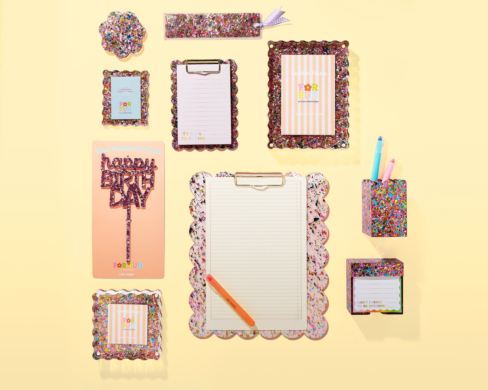 The confetti is hand-sprinkled into the acrylic, which means no shedding. Because of this unique process, no two pieces will be exactly alike.